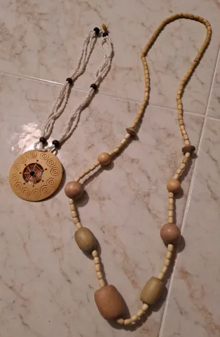 Non potrò effettuare spedizioni da domenica 01 marzo a lunedì 09 marzo! Due collane lunghe, una con perline bianche e un ciondolo rotondo in legno intagliato (più corta dell'altra e con chiusura come da foto), l'altra con perline di legno di varie forme e dimensioni. Vendo entrambe a 5€, altrimenti 3€ ciascuna su richiesta.