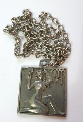 Bellissima collana anni ‘80 con ciondolo a forma di quadrato raffigurante la Vergine, segno zodiacale. Il ciondolo presenta un'incisione di una figura femminile e il simbolo astrologico. La catena è in metallo. Ciondolo 4 x 4 cm Lunghezza collana 36 cm