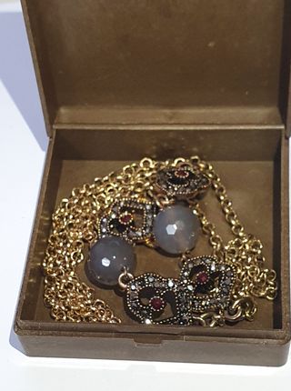 Bellissima collana antica del marchio Rosa Pepe, con dettagli in strass e pietre color grigio. Pendenti con pietre color amaranto. Perfetta per aggiungere un tocco di classe a qualsiasi outfit. Lunghezza 45 cm Collana venduta con scatola quadrata marrone