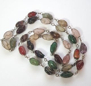 Bellissima Collana vintage con pietre colorate collegate con una maglia metallica, risalente agli anni '60. Pietre naturali di varie forme e colori sfaccettate e levigate. Collana lunga 38 cm Un pezzo unico che aggiunge un tocco di stile retrò.