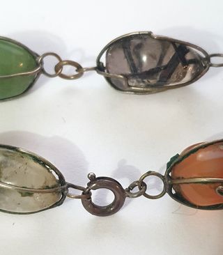 Collana vintage con pietre naturali incastonate in gabbie di metallo argentato. Pietre di varie forme e colori. Collana lunga 37 cm