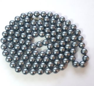 Bellissima collana vintage di perle in vetro da 10 mm, colore grigio. Perle rotonde e lucide. La chiusura è a vite. Perfetta per un look elegante e raffinato. Lunghezza 70 cm per fare un doppio giro