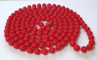 Bellissima collana vintage di perle plastificate molto lunga (90cm), colore rosso. Chiusura a moschettone dorata.