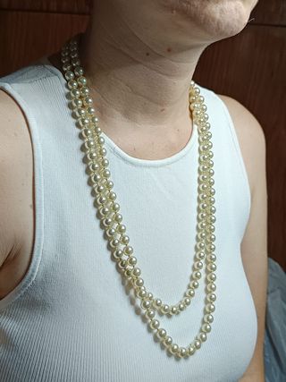 Bellissima collana a doppio filo di perle sintetiche, colore bianco. - Perle di forma rotonda e regolare. - Lunghezza ideale per essere indossata con diversi outfit.
