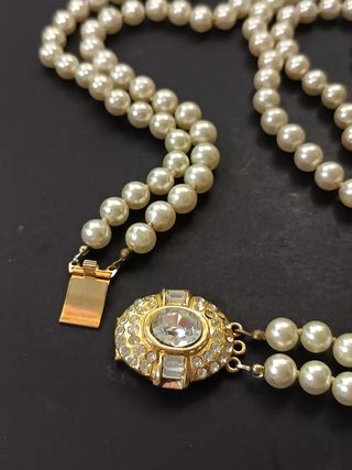 Elegante collana vintage a più fili, con perle bianche e dettagli dorati. - Design a tre fili. - Chiusura in argento 800 - Perle di forma irregolare.