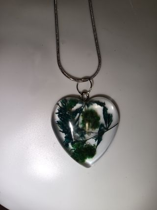 Bellissima collana a forma di cuore con fiori secchi all'interno, incastonati in resina trasparente. - Elegante ciondolo a forma di cuore. - Fiori secchi di colore verde e rosa. - Catena in metallo argenteo.