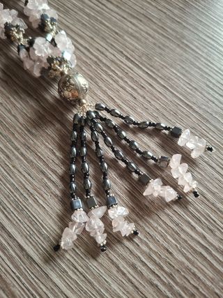 Bellissima collana con ciondolo, realizzata con pietre rosa e nere. - La collana presenta una combinazione di colori delicati ed eleganti. - Il ciondolo è un dettaglio unico e raffinato. - Perfetta per aggiungere un tocco di stile a qualsiasi outfit.