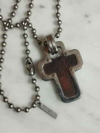 Collana con ciondolo a forma di croce, un accessorio dal design unico. - Ciondolo con inserto in legno. - Catena a palline in metallo. - Targhetta con logo inciso.