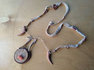 Fantasia etnica in questa rarissima collana con elemento legante in juta, con pendaglio in legno al cui centro c'è un bastoncello di corallo arancionato grezzo, e per abbellire il tutto ogni tanto ci sono inclusioni di terracotta a forma di spine e rondelle. Unicità ruvida. Misura da punta a punta è di 60 cm. Le foto descrivono esattamente il prodotto e sono parte integrante della descrizione. Visita il mio profilo per altre collane ed accessori per la persona. Prezzo non trattabile. - Cordino in juta intrecciata. - Ciondolo centrale in legno con corallo. - Elementi decorativi in terracotta a forma di artiglio.