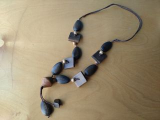 Collana artigianale con elementi geometrici in legno. Un accessorio unico che aggiunge un tocco naturale al tuo stile. Elegante e sobria collana in legno con geometrie di varie forme, con toni dal blu al marrone. Misura da punta a punta 46 cm. Le foto descrivono esattamente il prodotto e sono parte integrante della descrizione. Visita il mio profilo per altre collane ed accessori per la persona. - Design con forme quadrate e ovali. - Perle di legno scuro e chiaro. - Cordino resistente.