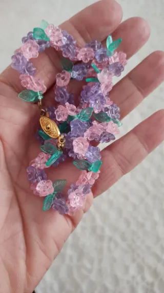 Collana vintage in stile flower Power, nuova, realizzata con una pregiata lavorazione di fiorellini e foglioline in materiale plastico in tenui e delicati toni pastello multicolore. Chiusura con susta. Lunghezza collana compresa susta cm. 40 - Fiori in materiale plastico traslucido. - Chiusura a moschettone dorata.
