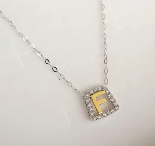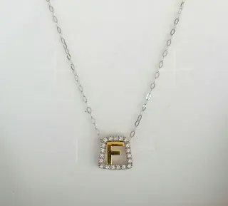 Elegante collana in oro bianco 18kt 750 con ciondolo in oro 18kt bianco e giallo a forma di iniziale F incorniciato da zirconi. - Ciondolo con iniziale F in oro giallo. - Cornice quadrata tempestata di zirconi. - Catena in oro bianco.