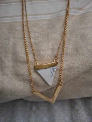 Collana in acciaio con dettagli in marmo bianco e finitura dorata. Si. Può anche creare il set di gioielli, disponibili pure - Orecchini coordinati a forma di triangolo. - Bracciale coordinato a forma di triangolo e cerchio
