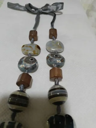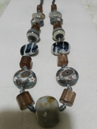 Collana con pietre di varie forme e colori. - Elementi in pietra con sfumature marroni e grigie. - Perle decorative con motivi floreali. - Chiusura sicura.
