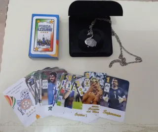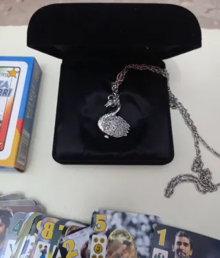 Collana lunga da donna con un ciondolo a forma di cigno tempestato di strass. Inclusa una scatola regalo nera e un mazzo di carte da gioco Forza Azzurri con giocatori e stemmi calcistici. - Ciondolo a forma di cigno. - Scatola regalo inclusa. - Mazzo di carte da gioco Forza Azzurri.