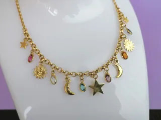 Bellissima ed Elegante collana giocollo 42cm realizzata in argento 925 con placcatura in oro, con pendenti a forma di stelle, sole, luna e tormaline colorate. - Materiale: Argento 925 - Finitura: Placcata oro