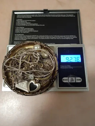 Lotto composto da diverse collane e ciondoli. Tutto in ottimo stato - Materiale: argento 925/800. - Peso totale: 100.39g. - La bilancia indica una capacità di 500g.
