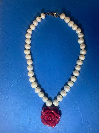 Elegante collana composta da perle di acqua dolce e un ciondolo a forma di rosa. - Perle di acqua dolce. - Ciondolo a forma di rosa rossa.