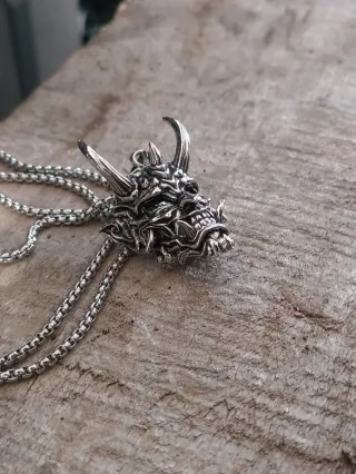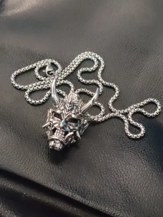 Collana con un ciondolo dettagliato a forma di maschera Oni. - Design ispirato alla maschera tradizionale giapponese. - Materiale metallico resistente.