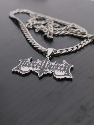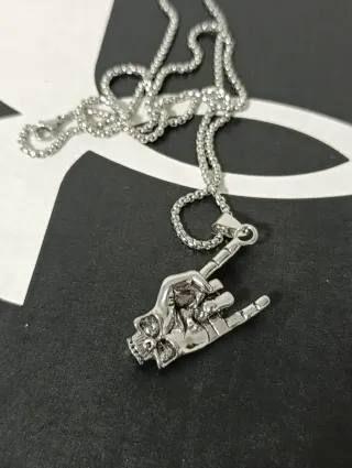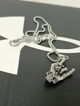 Collana con un ciondolo a forma di mano che fa il segno delle corna, con un teschio integrato. - Design unico e audace. - Materiale metallico lucido.
