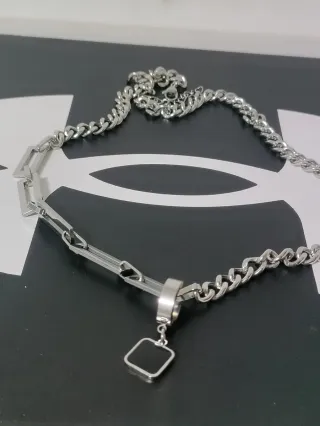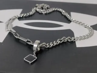 Elegante collana con un design moderno e accattivante. - Catena in metallo color argento. - Elementi a maglia rettangolare. - Pendente quadrato nero con bordo argentato. - Chiusura a moschettone.