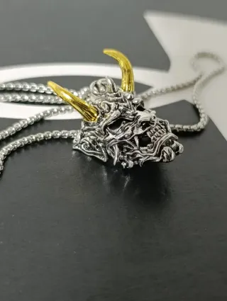 Collana con un ciondolo a forma di teschio stilizzato, ispirato a un demone giapponese. - Dettagli intricati sul volto. - Corna dorate. - Catena in metallo argentato.