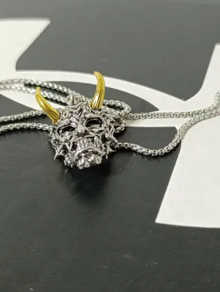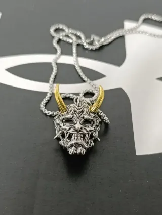 Collana con un ciondolo a forma di maschera Oni, un demone giapponese. - Design dettagliato e intricato. - Ciondolo bicolore argento e oro. - Catena in acciaio inossidabile.