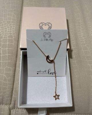 Delicata collana in acciaio inossidabile con finitura color oro rosa. Presenta un design moderno con un ciondolo a forma di luna e una stella che pende. - Materiale: acciaio inossidabile. - Finitura: color oro rosa. - Design: luna e stella.