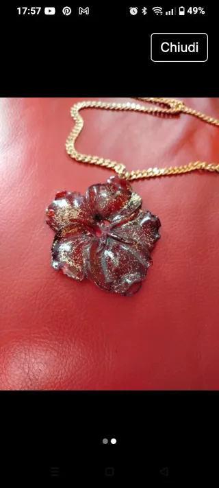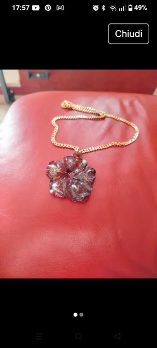 Collana vintage con ciondolo a forma di fiore. - Ciondolo color rosso con glitter dorati. - Catena color oro.