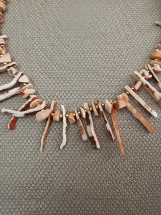 Collana realizzata con elementi naturali di conchiglia. La lunghezza totale aperta è di 62 cm. - Pezzi di conchiglia irregolari. - Dettagli dorati tra le conchiglie.