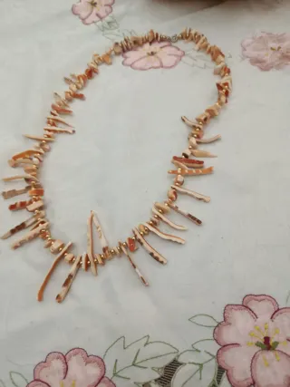 Collana realizzata con elementi naturali di conchiglia e corallo. La lunghezza totale aperta è di 59 cm. - Pezzi unici di conchiglia - Dettagli dorati tra le perle. - Chiusura a moschettone.