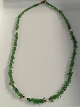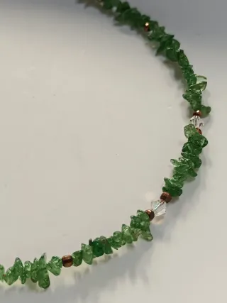 Delicata collana con pietre verdi naturali e dettagli dorati. - Pietre verdi grezze Tsavorite. - Elementi decorativi color oro. - Chiusura a moschettone.
