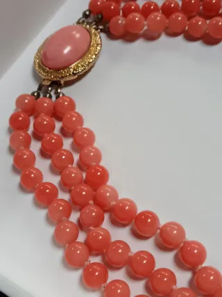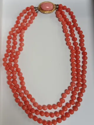 Collana tre finli di perle in vetro color corallo e chiusura dorata. - Perle tondeggianti. - Chiusura a incastro con finitura dorata.