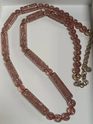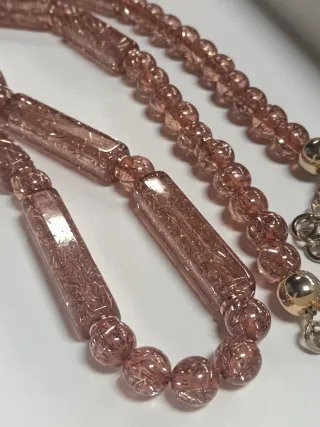 Elegante collana vintage con un design raffinato. - Perle sfaccettate color rosa antico trasparenti acrilico. - Dettagli metallici color oro. - Elementi decorativi allungati e perle tonde.