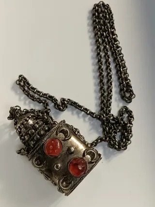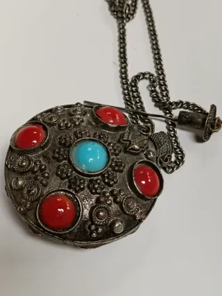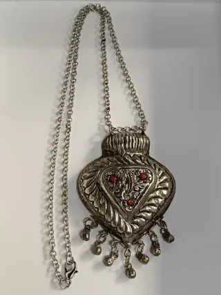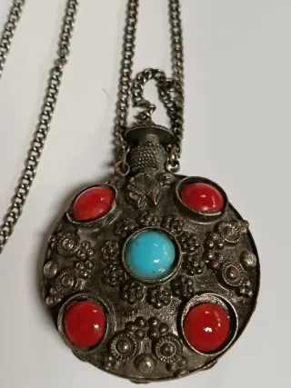 Antica collana Tibetana con pendente porta profumo decorato con motivi floreali argentata e pietre in vetro 41cm snuff bottle 5,5x6cm