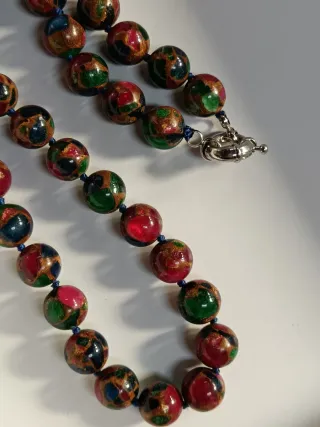 Bellissima collana artigianale Murano, risalente agli anni '80. Un pezzo unico che aggiunge un tocco di colore e originalità. - Perle in vetro di Murano con decorazioni floreali. - Alternanza di perle grandi e piccole.