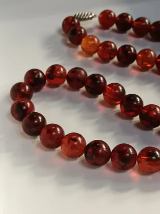 Collana vintage realizzata con autentica ambra naturale. Un gioiello unico che aggiunge un tocco di eleganza. - Perle di ambra naturale. - Design a due fili. Collana hand made bijou Doppio filo con perline in ambra naturale di colore rosso Gancio di chiusura in metallo Artigianale Usata ma conservata benussimo La misura è mostrata in foto Le condizioni sono ottime