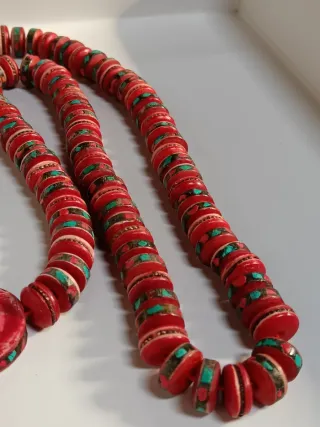 Mala tibetano con perline colorate. - cm40 - Perline rosse con inserti turchesi. - Elemento decorativo circolare rosso. - Cordino rosso con nappa finale.