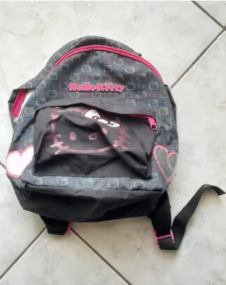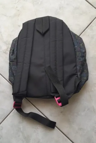 Zainetto per bambina con fantasia di Hello Kitty. È tenuto bene, usato poco. Il fiocchetto di Kitty riporta delle piccole parti senza il bianco. - Zip rosa. - Tasca frontale con zip. - Dettagli a forma di cuore.