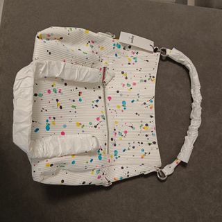 Borsa Desigual nuova con una vivace fantasia. - Design a righe bianche. - Dettagli colorati a macchie.