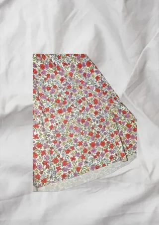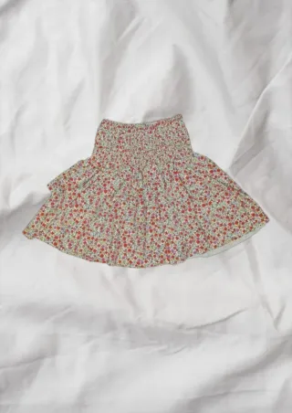 Gonna corta con stampa floreale vivace. Vita elasticizzata per un comfort ottimale. - Fantasia floreale multicolore con base rossa. - Tessuto leggero e arioso. Manca l'etichetta.