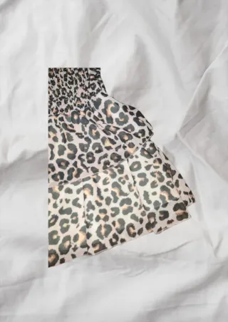 Gonna corta rosa con stampa animalier e vita elasticizzata. - Stampa leopardata. - Dettaglio a balze. - Tessuto leggero. Manca l'etichetta.