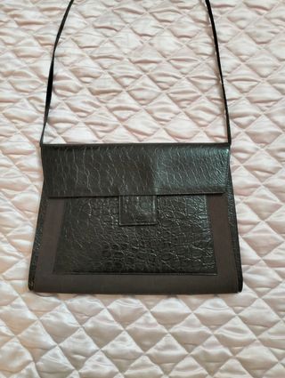 Borsa Borbonese in pelle con finitura effetto coccodrillo. È stata usata ed è vintage - Colore verde oliva. - Manici arrotondati. - Dettagli metallici argentati.