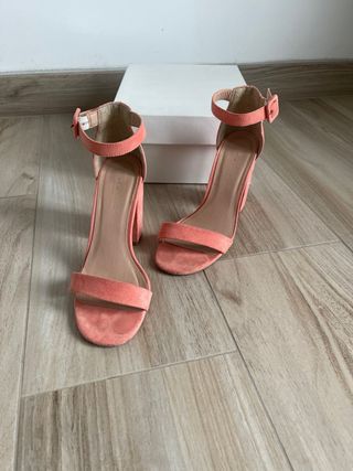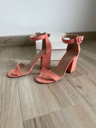 Sandali eleganti con tacco, realizzati in morbida similpelle scamosciata. - Tacco largo e comodo. - Cinturino alla caviglia con fibbia regolabile. - Design a punta aperta. La parte scamosciata non è perfetta in ogni punto, come ad esempio sul tacco