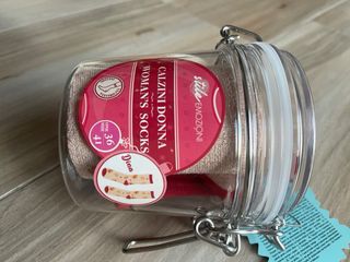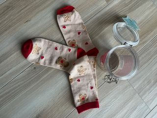 Un simpatico paio di calze a tema natalizio, perfette per la stagione. - Design con biscotti di pan di zenzero, stelle e cuori. - Bordi e tallone rossi. - Presentate in un barattolo trasparente con chiusura a clip.