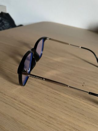 Eleganti occhiali da vista con montatura nera e dettagli dorati. - Montatura in acetato nero lucido. - Aste sottili in metallo color oro. - Design moderno e raffinato.