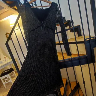 Elegante vestito corto con un design raffinato. - Tessuto scintillante. - Maniche lunghe in tessuto trasparente. - Scollo a V con fiocco decorativo. - Lunghezza al ginocchio.