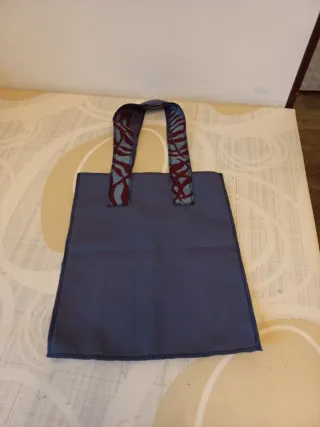 Borsa a tracolla colori azzurro e bordeaux con retro grigio. In tessuto jacquard. Tipo Sumbrella Ikebana. Misure 38x33. - Tessuto con motivo a foglie. - Manici in tessuto grigio azzurro e bordeaux.