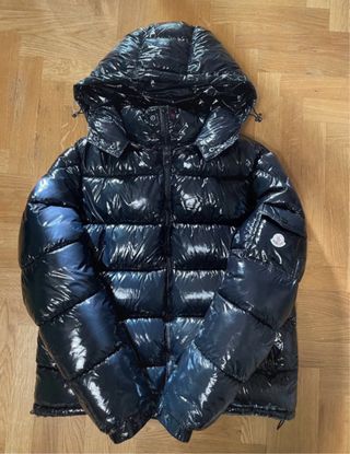 Piumino nero lucido, un capo iconico per un look audace. - Design trapuntato. - Cappuccio integrato. - Chiusura frontale con zip. - Tasca sulla manica con logo.