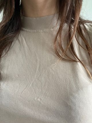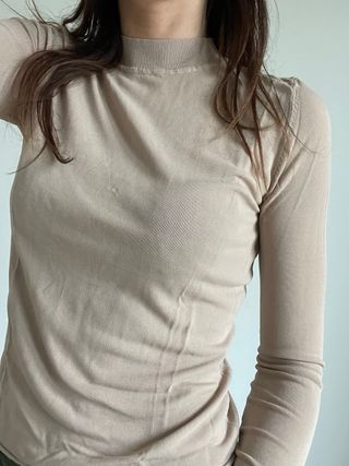 Maglietta Zara con un elegante collo a coreana. Il tessuto è leggermente lucido e dona un tocco raffinato. - Collo a costine. - Maniche lunghe. - Tessuto morbido e confortevole.